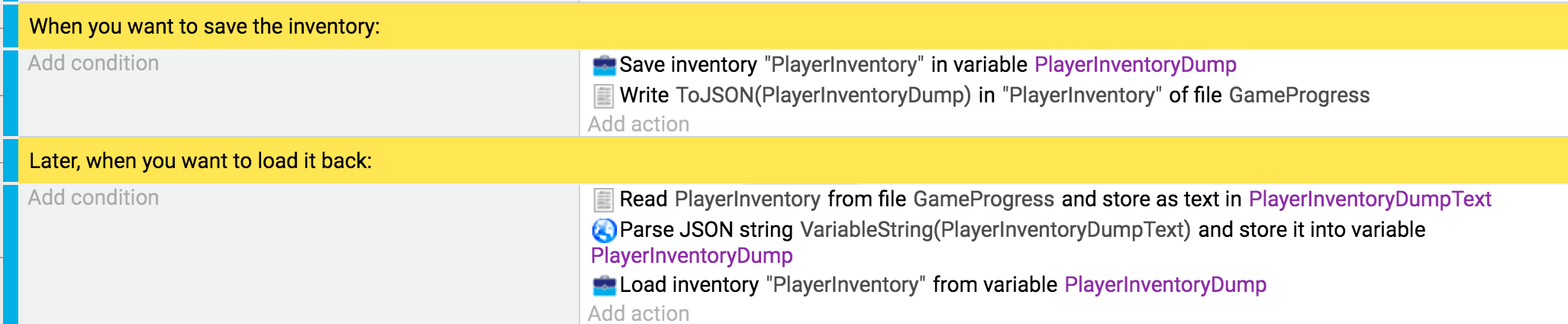 Las acciones "Guardar un inventario en una variable" y "Cargar un inventario desde una variable", le permiten volcar el contenido de un inventario en una variable. Estas acciones se establecerán como una variable estructurada. La información será contenida como niños. Las acciones también se pueden utilizar para restaurar un inventario a partir de una variable.