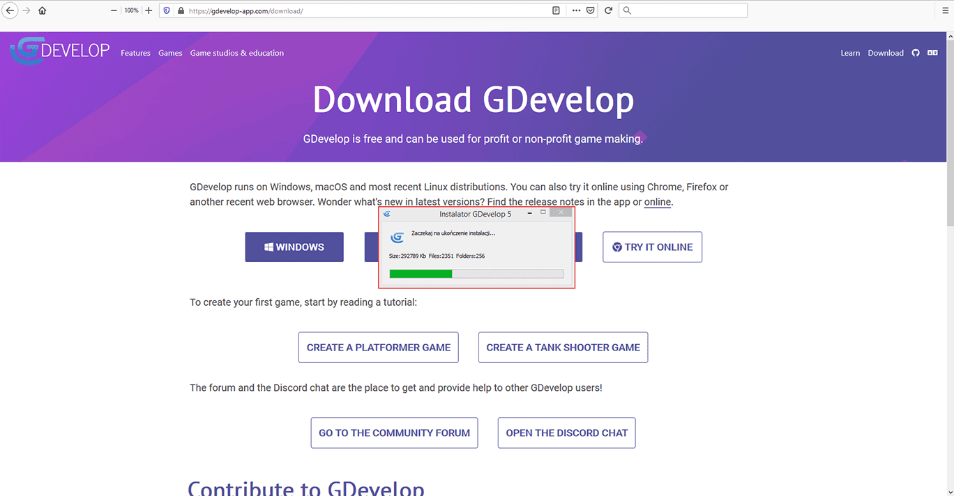 Para obtener su copia de GDevelop puede visitar la Página de descarga en donde están disponibles las distribuciones para Windows, Mac OS, and Linux.