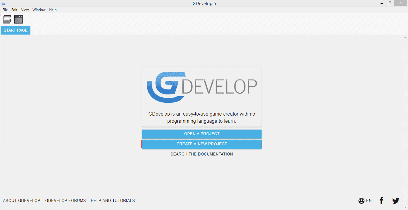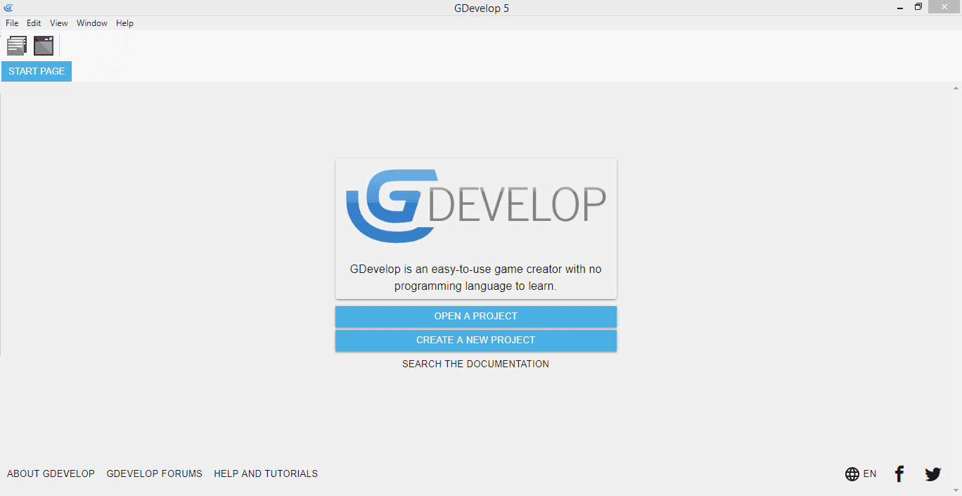 Espere hasta que se complete el proceso, navegue hasta donde están instalados todos sus nuevos programas y haga doble clic en la aplicación GDevelop para iniciar el editor. Serás recibido con la pantalla de bienvenida en la página de inicio.