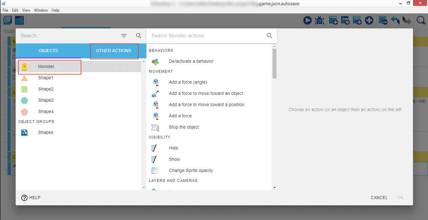 Cette action ouvre une fenêtre contextuelle où vous pourrez choisir et charger un fichier audio qui sera joué lorsque une forme est collectée par le monstre. Pour nous, il s'agit du fichier monster.wav.