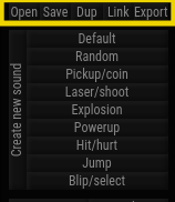 You can also save the sounds as a ".jfxr" file using Save. Which you can open later and continue working on by opening it with Open. You can also export the sound externally using Export. You can even generate a link to your sound.