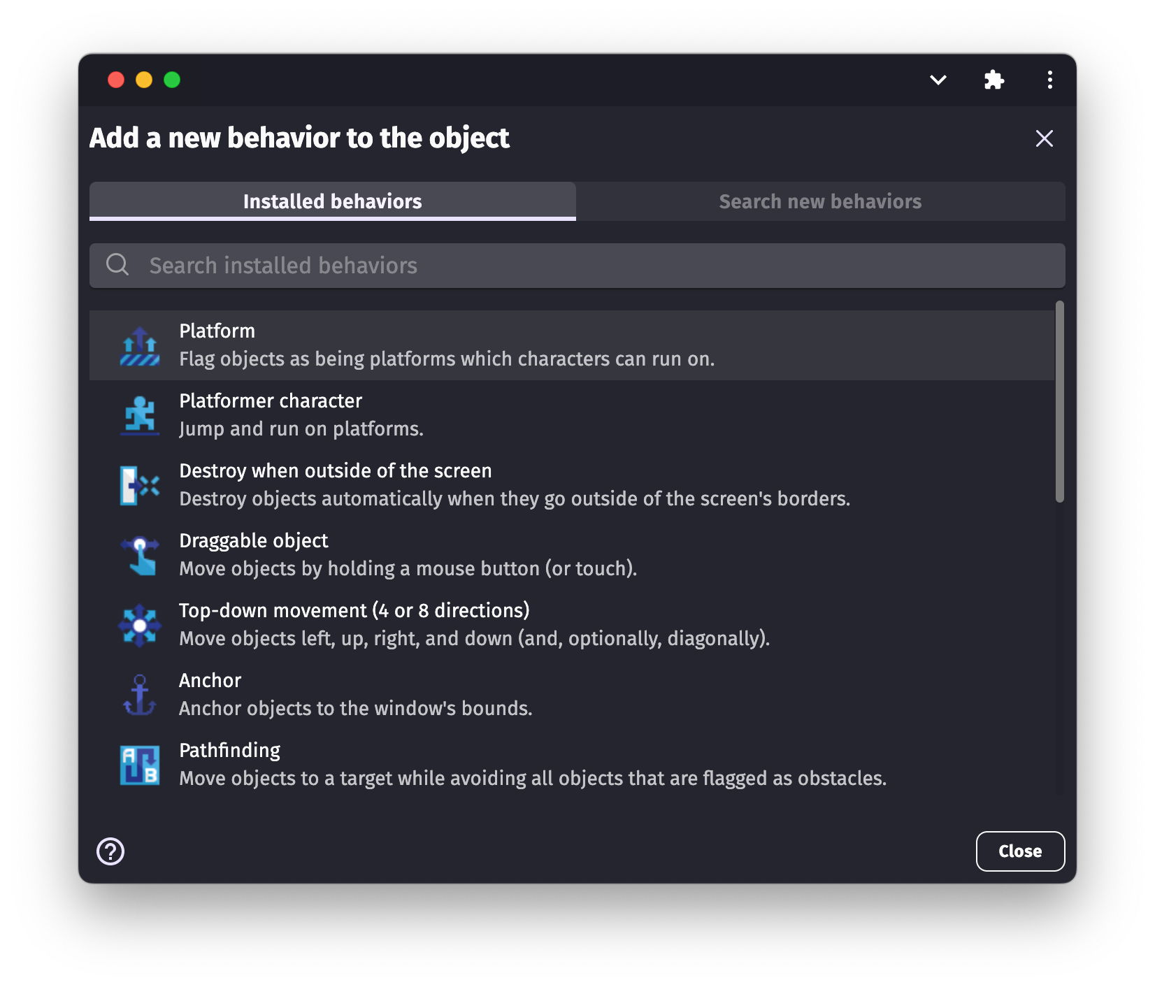 The advanced platformer movements extension contains behaviors for: