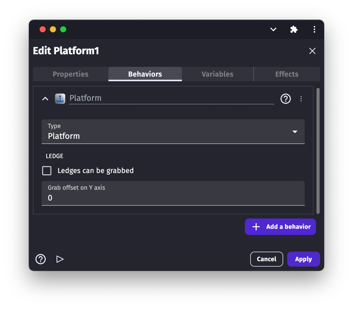 As with the Platform Behavior, we have the "Grab the ledge" option for the "Platformer character". This option allows the character object to grab the ledge of the platforms. The option is disabled by default. To enable it, tick/check the box in the options list.