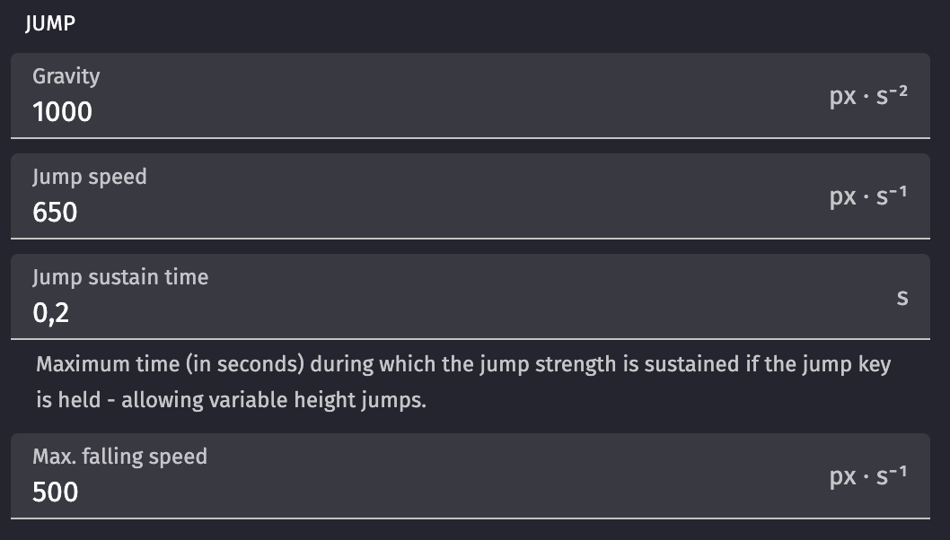 - Max. falling speed to avoid characters going faster and faster because of gravity.