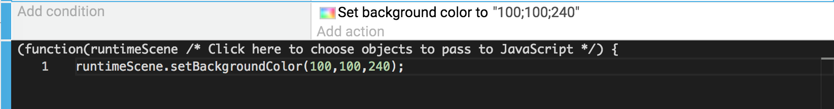In all JavaScript events, you have access to a variable named runtimeScene. This variable represents the scene being played. Below is an example of a standard GDevelop event, and an equivalent event that uses a JavaScript: