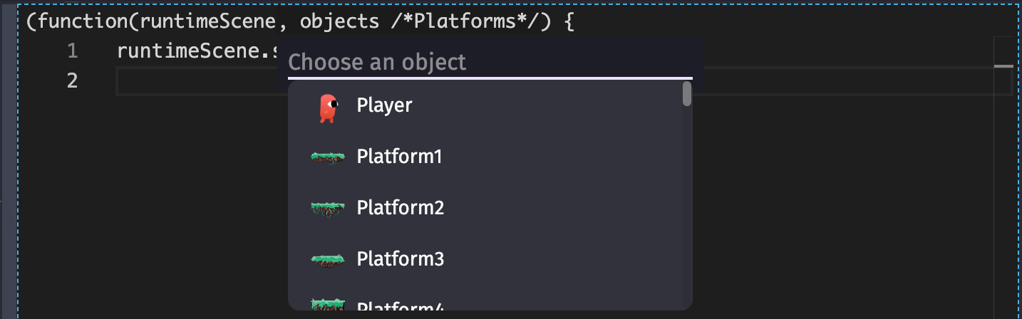 Most of the time annotations are not needed. The methods that you are using are already setup with type annotations. But when you use a list of objects, you may want to access this object specific method (for example, methods to modify the animation of a sprite object). In this case, you could write /** @type {gdjs.SpriteRuntimeObject} */.