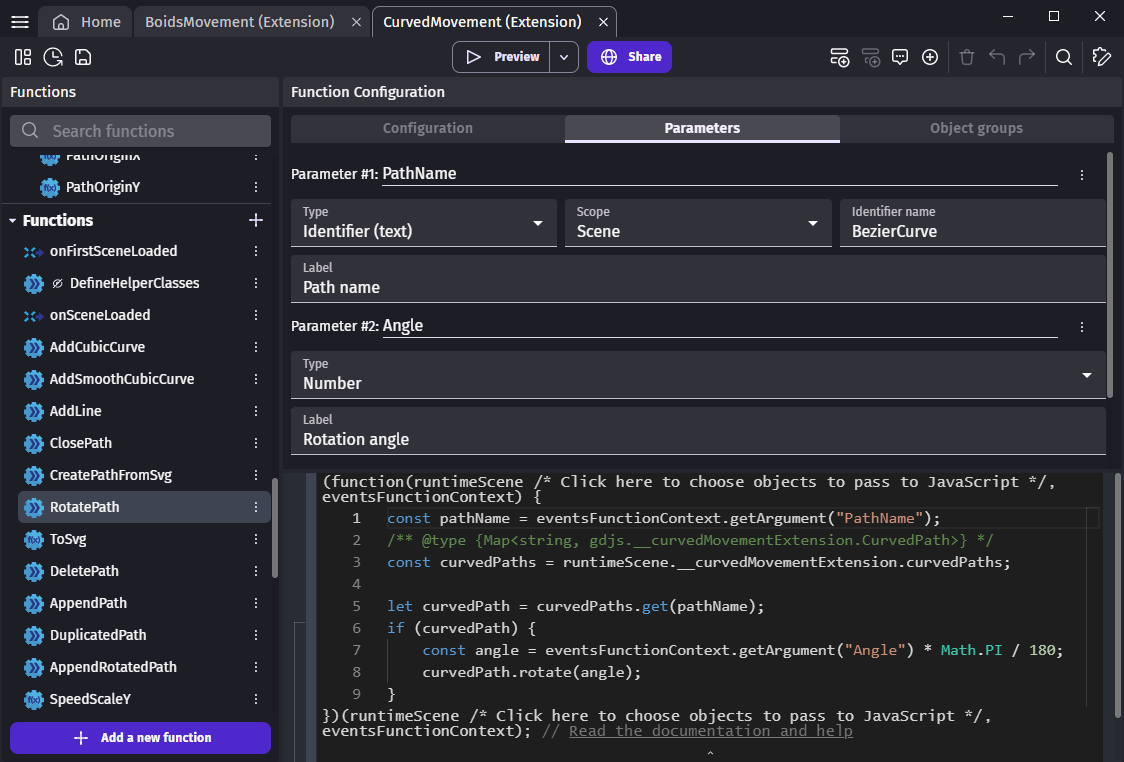 - The Curved movement extension evaluates Bézier curves using JavaScript and handles movement logics with events.