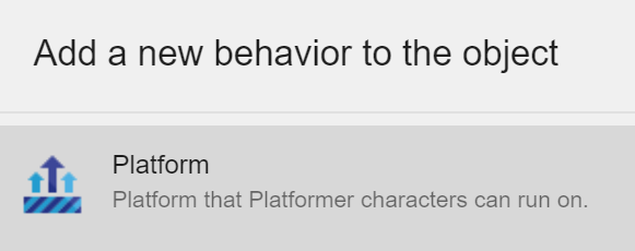 Notice that I have also changed the default object name to "Platform". Change your Default width to 193 and Default height to 40, for now. Now, we need to add a Behavior for this object, in a way similar to when we added behavior for our Player Sprite. Go to the Behaviors tab, click to add a behavior to the object and choose Platform type of behavior.