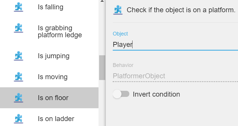 As mentioned above, we need to fix the Player Sprite sliding issue. To do that, we will make use of a new event. Click to add a new event, and "Add a condition", Platform Behavior->Options->Is on floor. Choose the object to be Player because this is what we are trying to check, i.e, whether the character "is on floor".