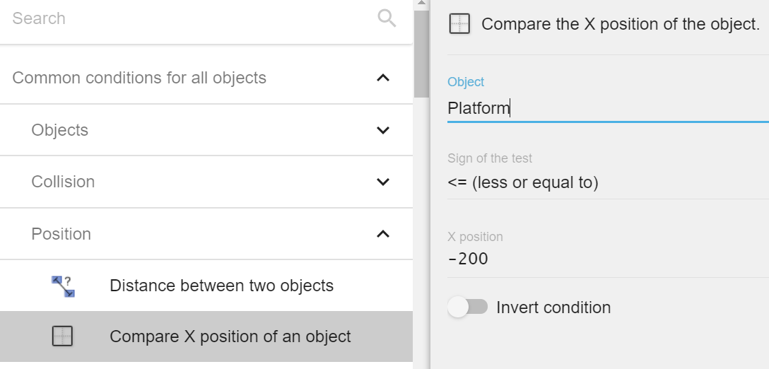 As you can see, the X position of the last tile is 1550 for me. Don't worry if it's different for you. Whatever be the value, we will use that value to make the platforms endless. Now, Add a condition for this new event. Find Common conditions for all object->Position->Compare X position of an object. Choose the object "Platform" with Modification sign ≤ (less or equal to) and value let's say -200.