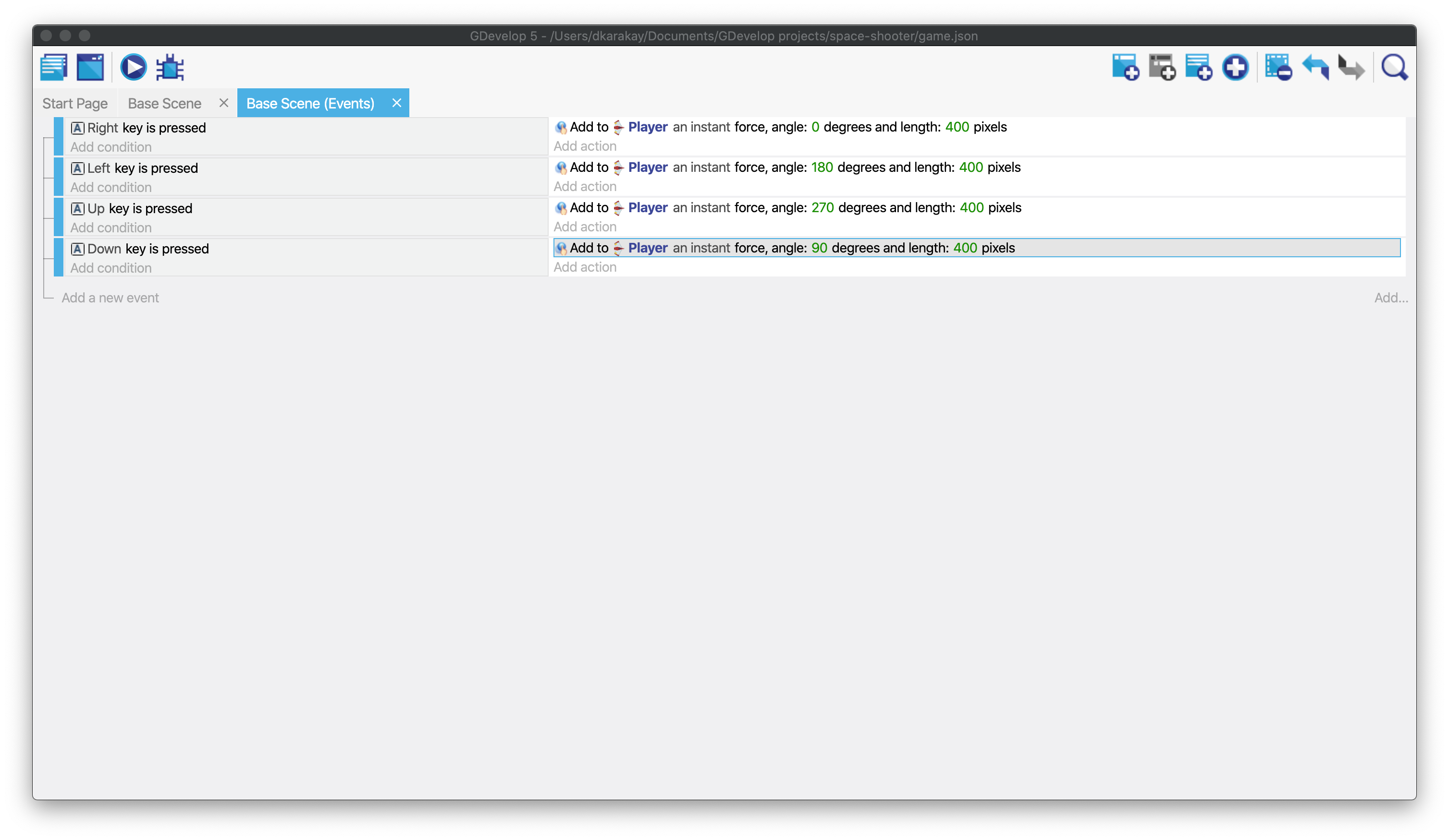 Click on the "Base Scene (Events)" tab to open the events editor, where we define the rules of the game using conditions and actions. Click on the event icon to add an empty event.