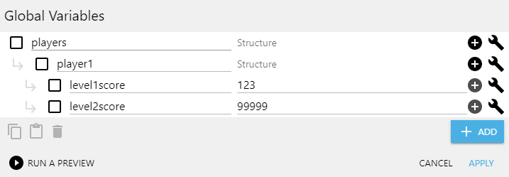 GDevelop では、数値やテキストのようなデータを一時的に格納するために、_変数_を使うことができます。たとえばプレイヤーの名前、体力、スコアなどを変数に記憶しておけます。