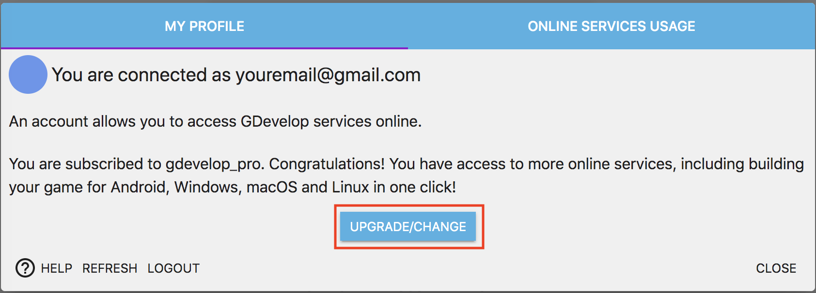 アカウントにログインすると、自分のプロファイルを見ることができます。GDevelop の特定サービスも使用できます。ワンクリックで Android 向けにゲームをパッケージ化するなどのサービスもあります!