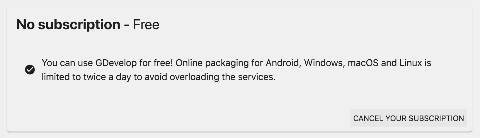 サブスクリプションを取得すると、この 1 日 2 パッケージ制限が解除されます。将来的には、他の OS へのワンクリックパッケージや便利なサービスも提供される予定です。これらのサービスの一部は現在ベータテスト中です。またサブスクリプションは、GDevelop の将来の開発も支えています✨
