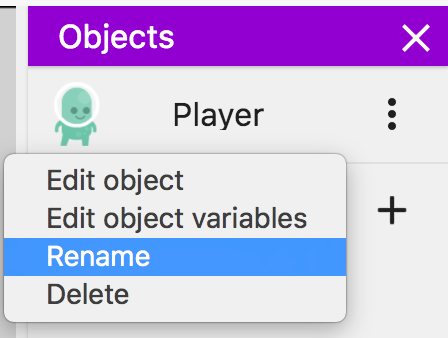 为了非常容易地在游戏中引用对象, 给他起一个名字而不使用默认名字. 在其上鼠标右键(或者点击 ⋯ 图标) 选择“重命名”.然后你可以输入 "Player" 并在屏幕的任意位置点击一下或者按下回车键给这个对象改名.